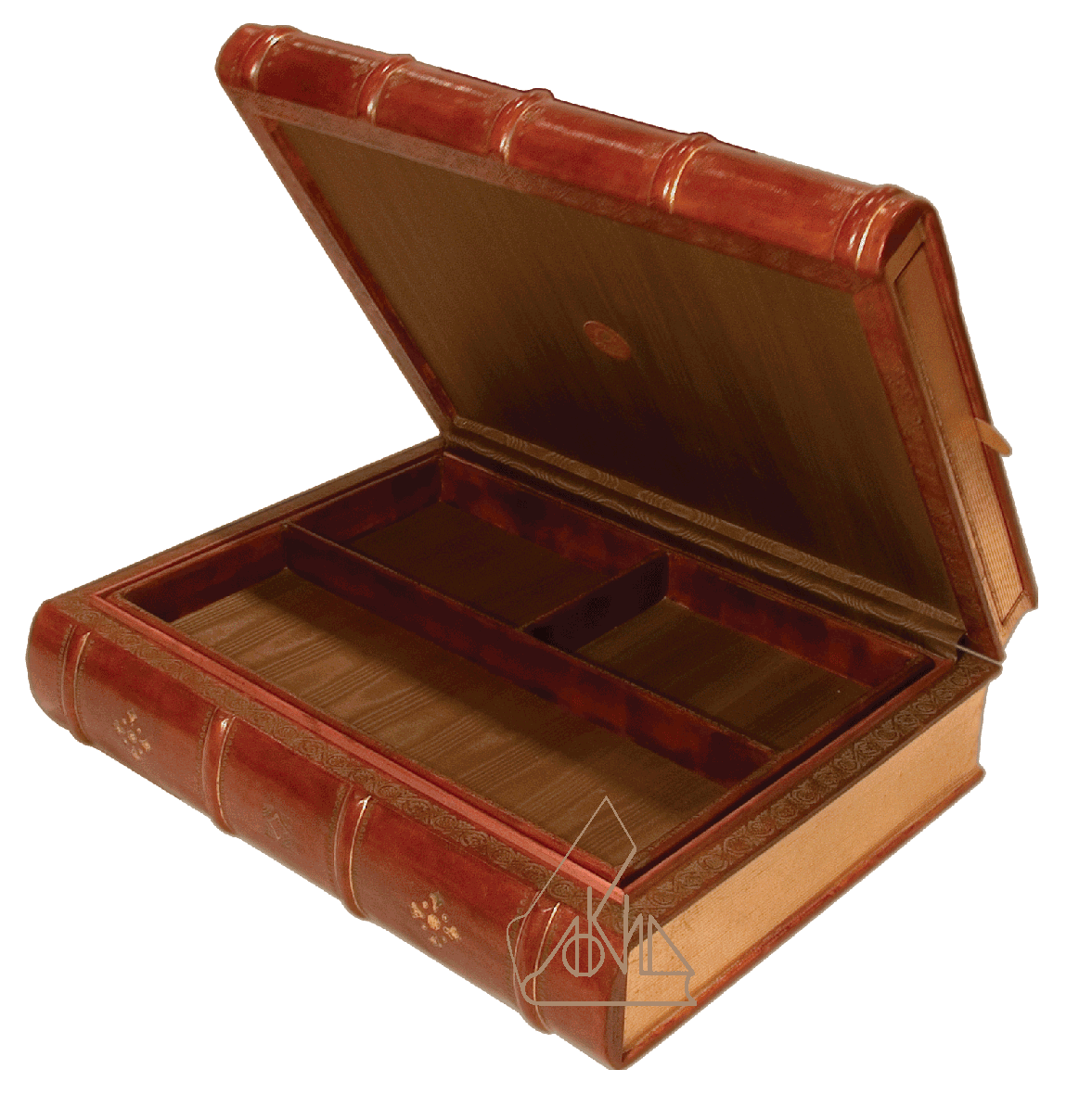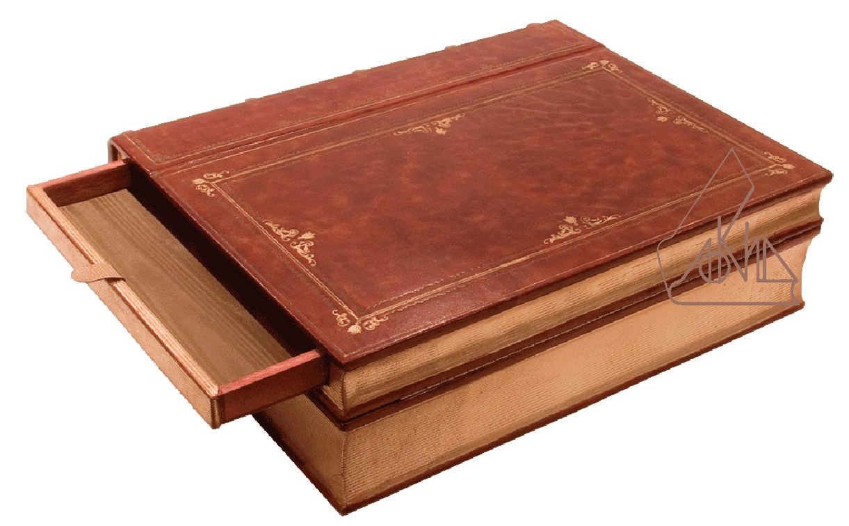 Изделие выполнено вручную флорентийскими мастерами. Стилизовано под старинную книгу, в технике Faux Books Antique. Основа изделия дерево, верх обтянут овечьей кожей, внутри отделка муаром, с металлическими застежками.